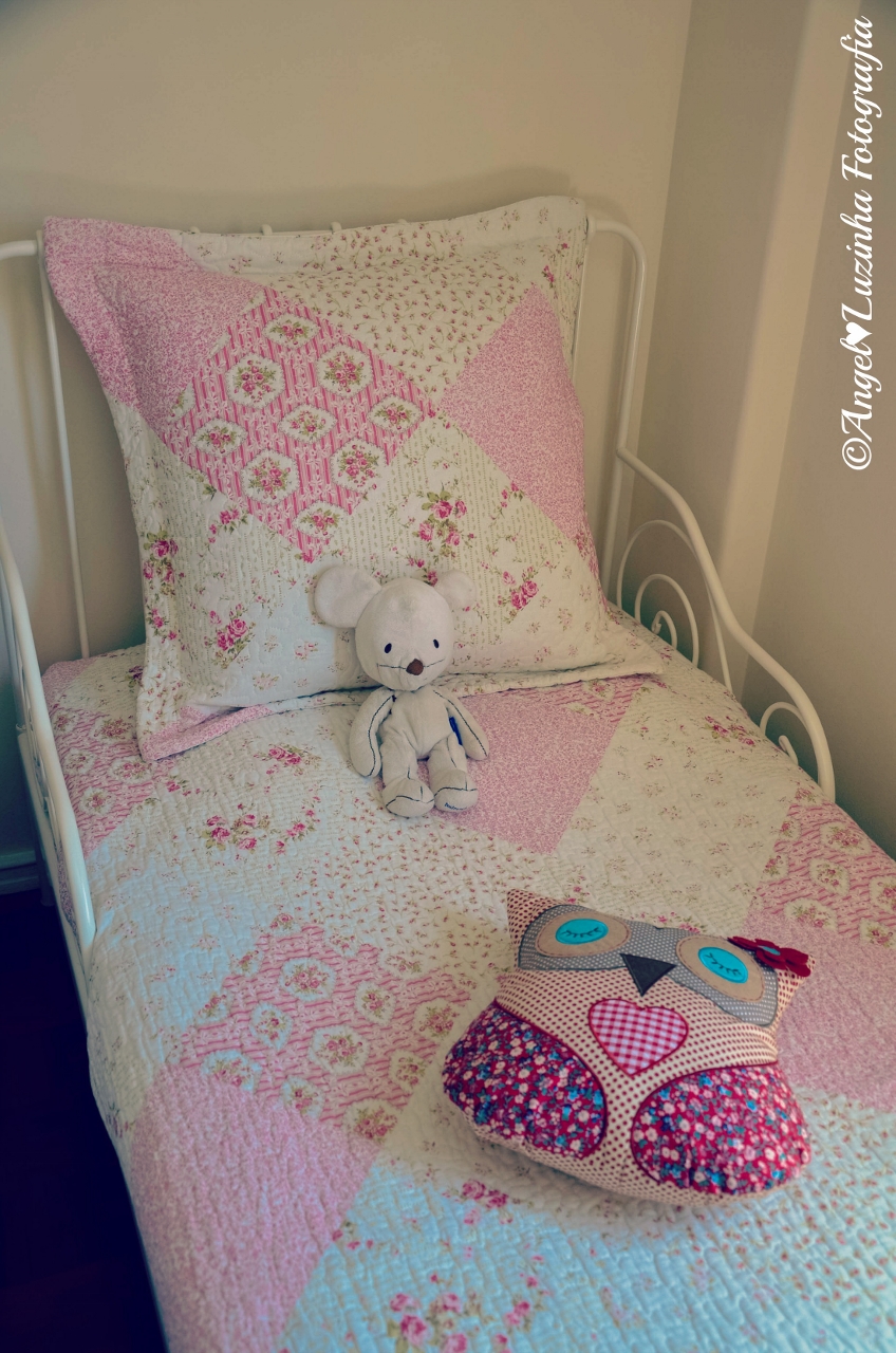 A antiga vai para o Alentejo (não se quer desfazer dela! É mesmo agarrada às suas coisinhas!) e a nova faz agora as suas delicias e a de todos os bonecos que lhe fazem companhia à hora de dormir. "Adoro a minha cama nova mamã! Posso dormir nela para sempre?"... e a resposta é SIM porque a cama tem uma boa largura e é extensível até 2 metros. É uma cama para ficar e para crescer! E ficou linda com a colcha e as almofadas da